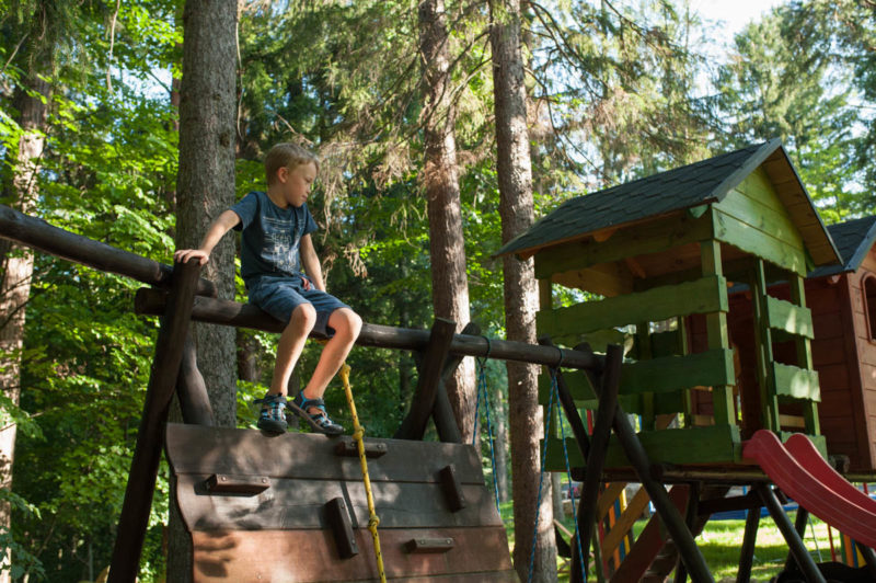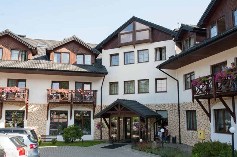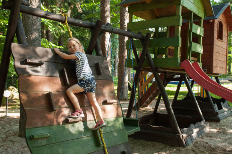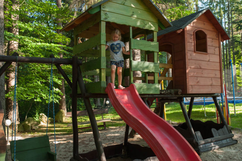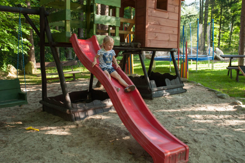 Hotel położony jest w centrum Karpacza, ale z dala od miejskiego zgiełku. Otoczony jest lasem i górskimi potokami, co daje ukojnie dla przemęczonych rodziców ;) Na tyłach hotelu znajduje się plac zabaw dla dzieci, które mogą szaleć do woli na trampolinach, zjeżdżalniach, bawić się w piaskownicy czy wspinać po ściance. Rodzice zaś relaksują się w hamakach lub na leżakach podziwiając Śnieżkę.
