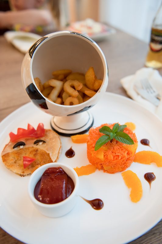 Po wypakowaniu rzeczy zeszliśmy do części restauracyjnej na obiadokolację. I tu ogromne zaskoczenie, gdyż dzieci otrzymały swoje dodatkowe menu, w którym oprócz opisu dań mają obok zdjęcia wybranego posiłku. To jest coś czego w restauracjach brakuje, a tu mali goście traktowani są na równi. Po wybraniu dań, dzieci mogły śmignąć w wyznaczone miejsce gdzie mogły się pobawić. Takie miejsce do zabawy to niezwykły komfort dla rodziców, którzy nie są zasypywani ciągłymi pytaniami „Długo jeszcze?! Kiedy będzie jedzenie?!”.