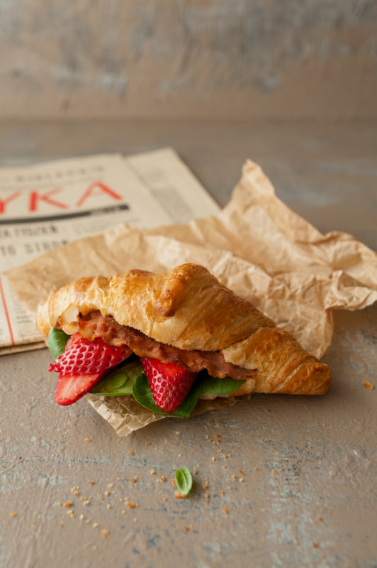 Croissant z boczkiem i truskawkami to smaczna i szybka przekąska dla zabieganych osób. Croissant z chrupiącym chipsem z boczku i soczystą truskawką to prawdziwa uczta smaków.