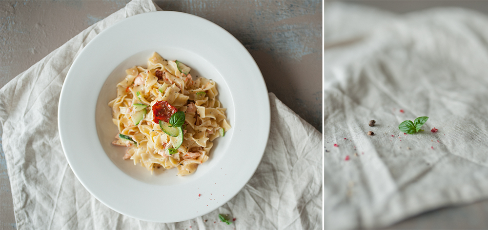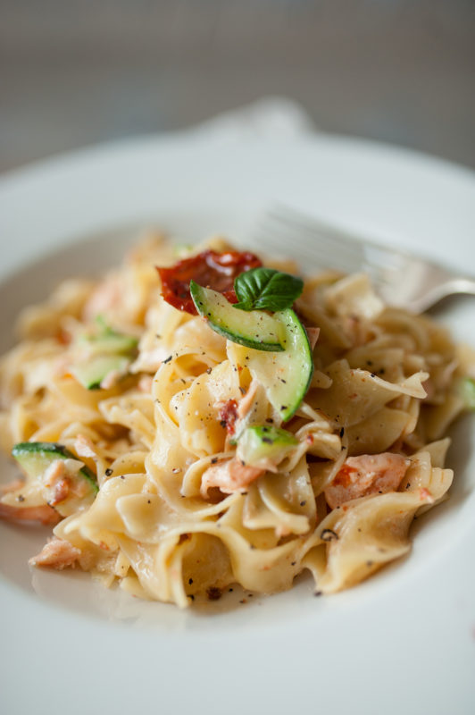 Do gotującej i osolonej wody wrzucamy makaron. Gotujemy zgodnie z instrukcją na opakowaniu. W między czasie kroimy suszone pomidory na cienkie paski. Myjemy łososia i kroimy na kawałki. Cukinie myjemy i kroimy w cienkie półksiężyce. Na patelni rozgrzewamy 3 łyżki masła i smażymy łososia, po chwili dodajemy cukinię. Doprawiamy do smaku. Makaron odlewamy, ale go nie przelewamy. Makaron wrzucamy na patelnię gdzie smażyliśmy łososia i cukinię. Dodajemy pokrojone w paseczki suszone pomidory. Wlewamy śmietankę i całość energicznie mieszamy, do połączenia się składników. Dodajemy do smaku wyciśnięty sok z cytryny i wsypujemy garść startego sera. Całość mieszamy i wykładamy na talerze.