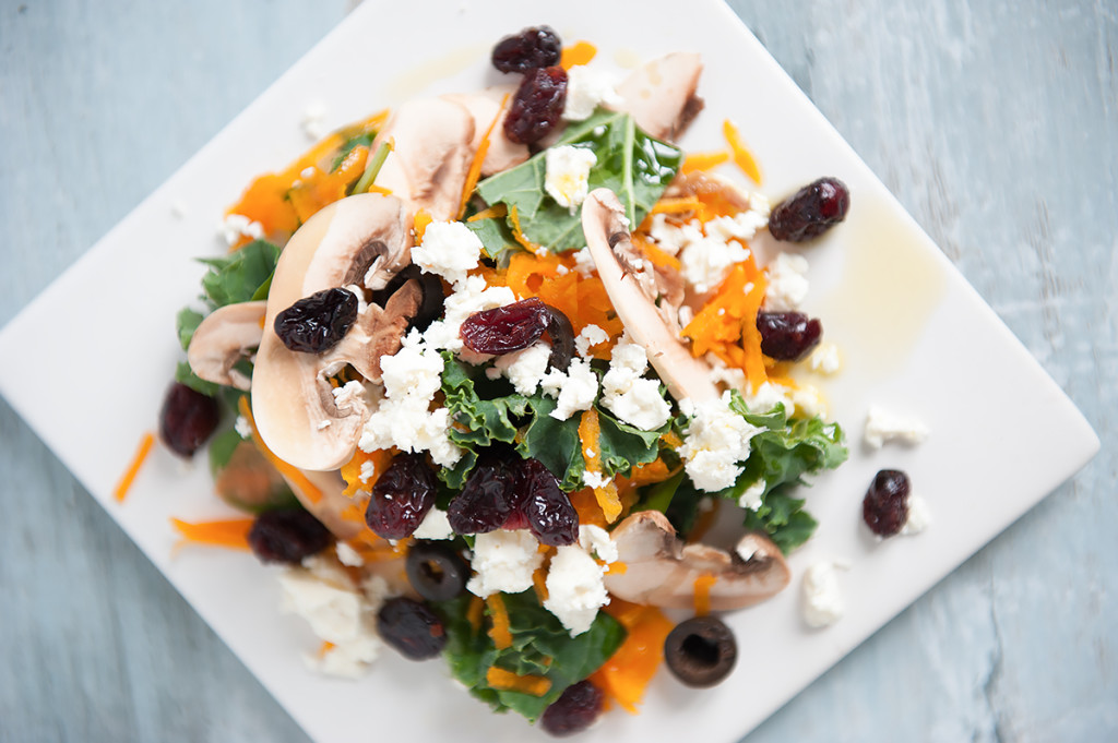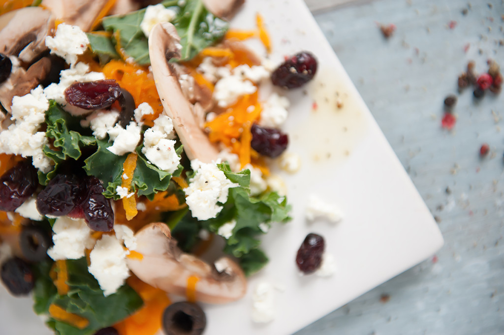 Do startej na grubych oczkach dyni dodajemy gałkę muszkatołową, sól, pieprz i mieszamy. Sałatę układamy na talerzu, układamy startą dynie, pieczarki, żurawinę oraz pokrojone w plasterki oliwki i posypujemy kozim serem. Czosnek drobniutko siekamy, solimy i dodajemy do miseczki. Dodajemy miód, sok z cytryny, oliwę doprawiamy solą i pieprzem. Całość mieszamy i polewamy sałatkę sosem.